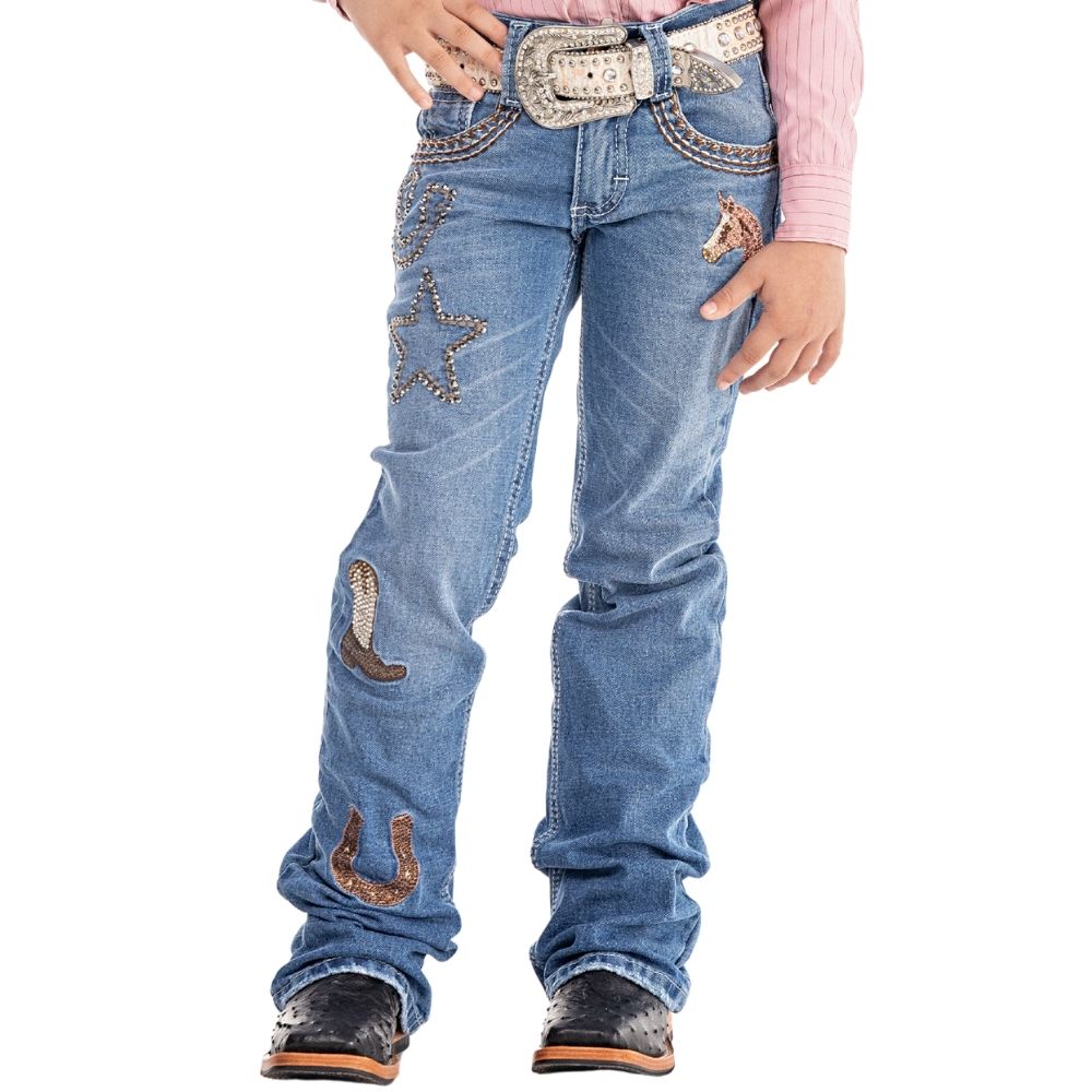 Calça Infantil Feminina Zenz Western Jeans Kids Moomoo Azul Médio Bordados E Strass Ref:ZW0325056-1603