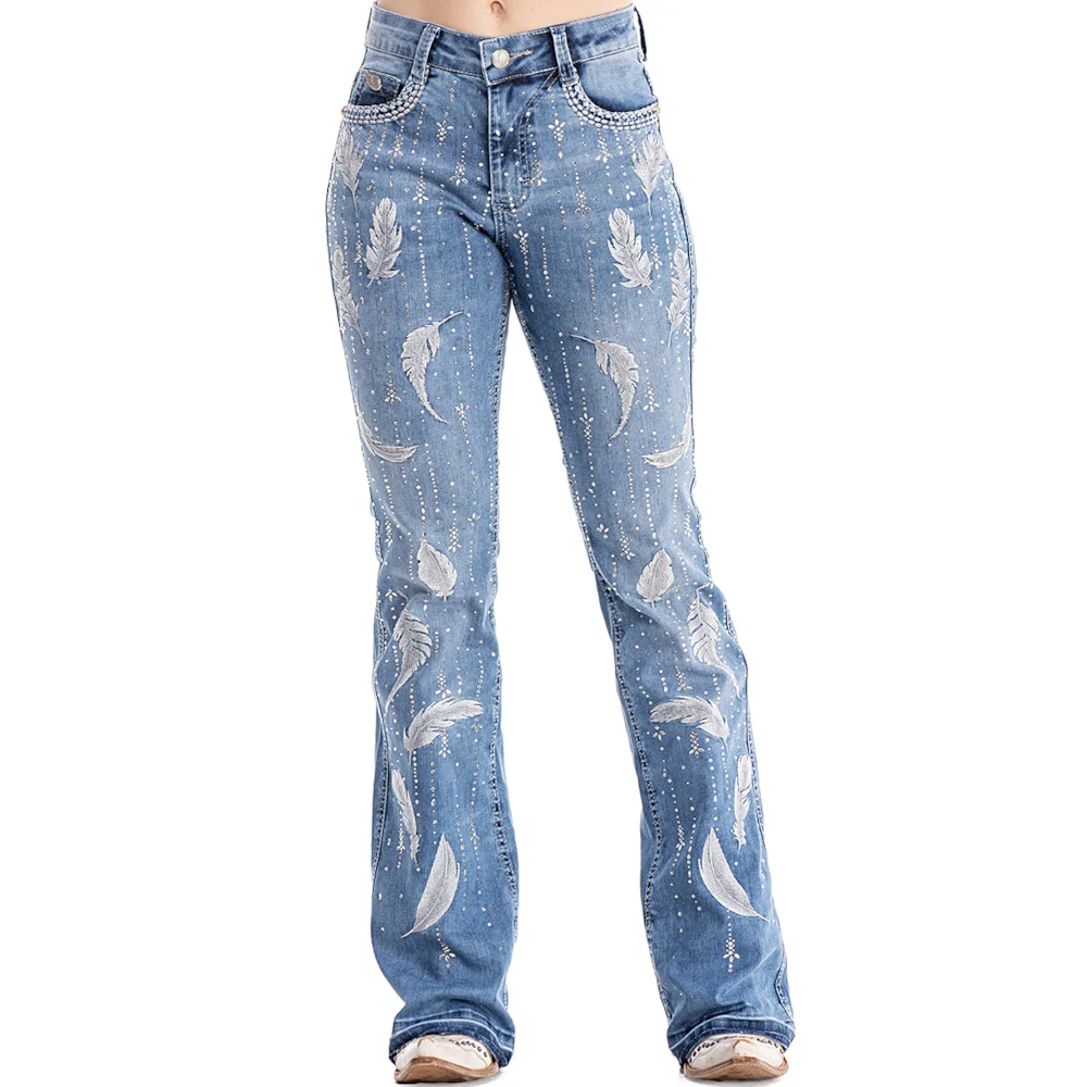 com design exclusivo, este jeans feminino de modelagem flare e cós médio é a peça-chave para quem busca estilo e sofisticação. ele apresenta ricos bordados rústicos na cor cinza claro que adornam o bolso traseiro, a pala e o bolso frontal, enquanto toda a frente é ricamente decorada com penas e aplicações de cristais incolor, conferindo um brilho sutil e elegante. a barra desfeita adiciona um toque moderno e despojado. pensando na durabilidade, possui costura de reforço na lateral e no entrepernas, além de aviamentos personalizados que atestam a qualidade. a composição é de 98% algodão e 2% elastano, garantindo conforto e caimento perfeito. a lavagem é artesanal em tom azul claro com efeitos suaves, realçando os detalhes da peça.