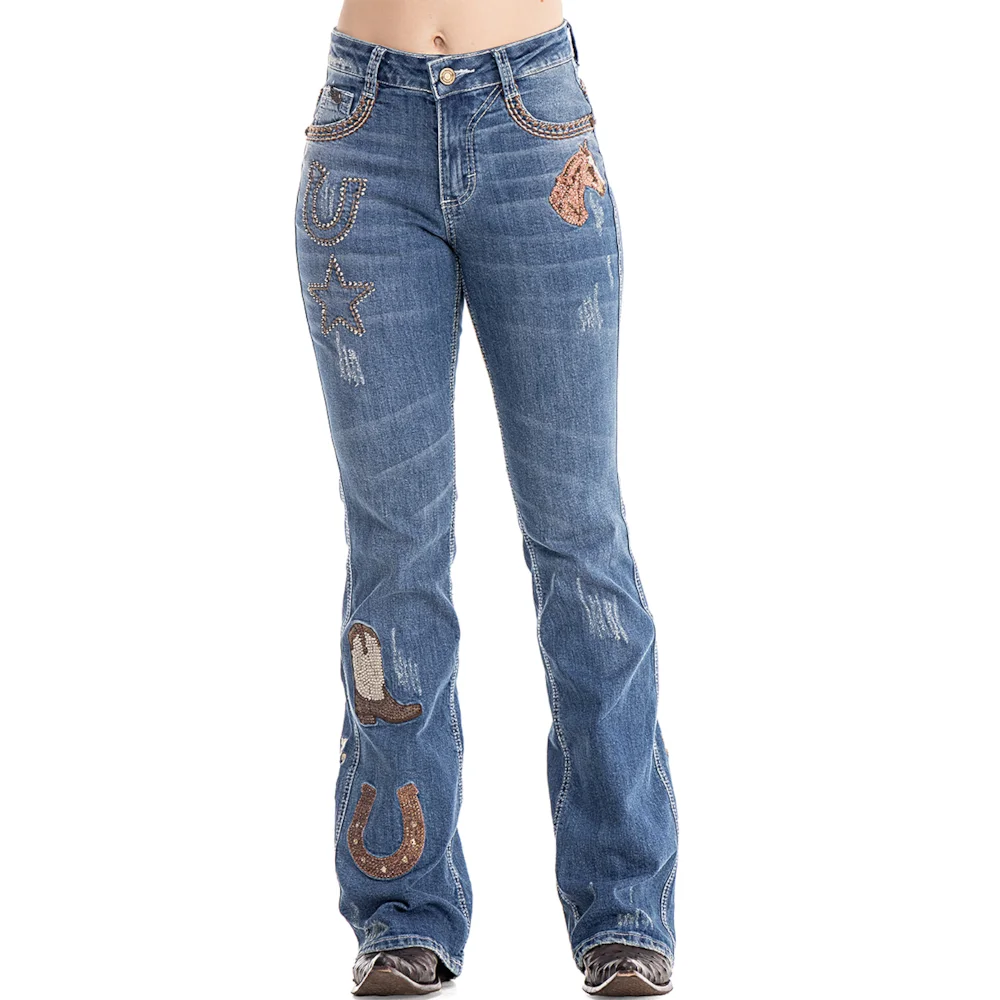 jeans feminino com modelagem flare e cós médio. possui bordado com pontos decorativos rústicos na cor palha no bolso traseiro, na pala e no bolso da frente. é decorado com patches temáticos e cristais na parte frontal, além de texto bordado na barra traseira.