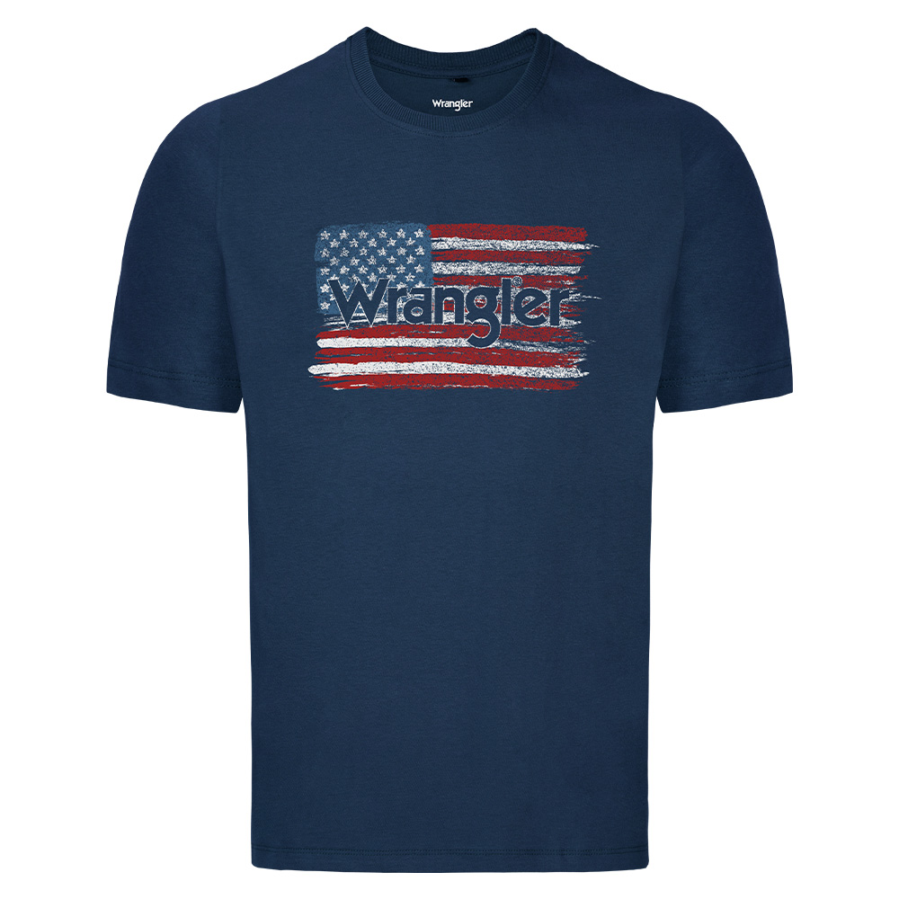 Detalhes de marca: Geralmente apresenta logo Wrangler estampado ou bordado, possivelmente com elemento gráfico associado ao tema “EUA/americana”.