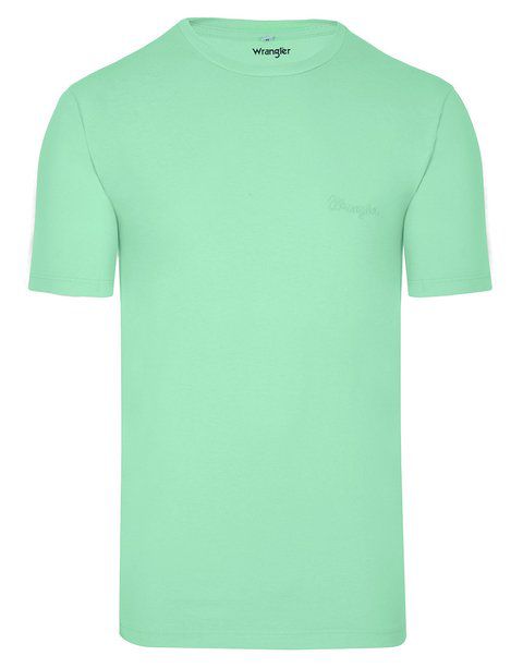 Camiseta masculina Wrangler fabricada em tecido 100% Algodão na cor Verde Claro, possui mangas curtas, gola tradicional e bordado no peito.