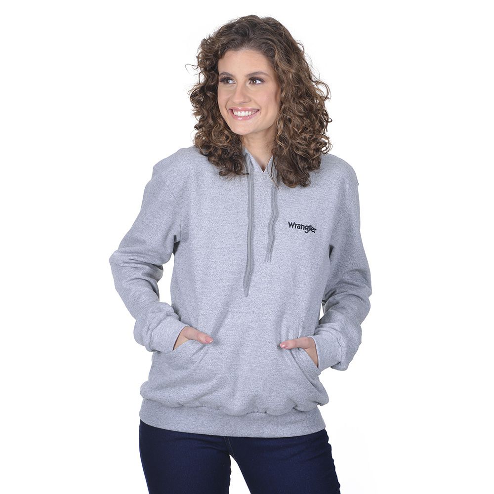 Moletom Feminino Wrangler. Possui capuz, dois bolsos, barra e punhos em elástico e estampa na parte frontal e parte interna do capuz.
