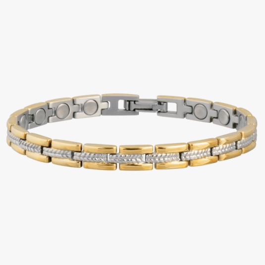 Aço inoxidável polido e banho de ouro polido tornam este design popular entre as mulheres. Este design possui vários elos e um ímã de samário-cobalto de 1200 gauss em cada um! A Sabona escolhe ímãs de samário-cobalto pela durabilidade a longo prazo e qualidades de resistência à ferrugem.